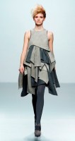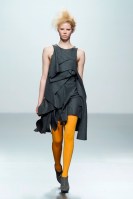 Una revisión de prendas clásicas en la que combina patronaje oriental y occidental. La paleta de colores utilizada se compone predominantemente de tonos neutros, con importante presencia del gris.