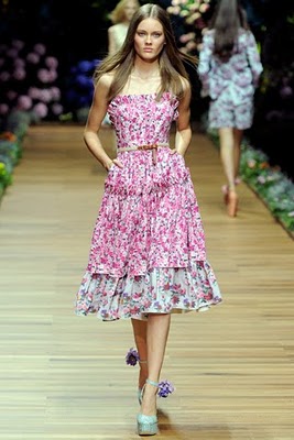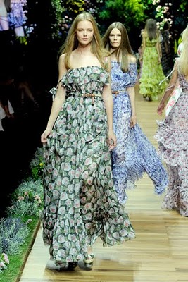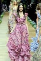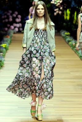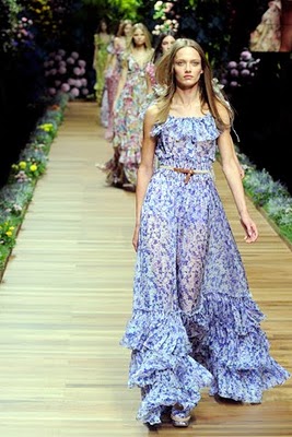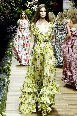 He de decir que las fotos del desfile de D&G, la línea más económica de Dolce & Gabbana, me ha abrumado un poco. No es porque no me gusten los maxi vestidos con estampados de flores que tanto se llevan esta primavera. Quizá haya sido la explosión de colores, o los volantes, o ver tantos y tantos metros de telas vaporosas flotando y transparencias. Creo que estos vestidos sería mejor verlos de uno en uno…