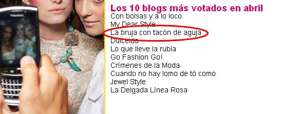 La Bruja con tacón de Aguja está de enhorabuena, porque un mes más sigue entre los diez blogs más votados para el Premio Nacional Marie Claire al mejor blog de moda, y eso es, por supuesto, gracias a vuestros votos.