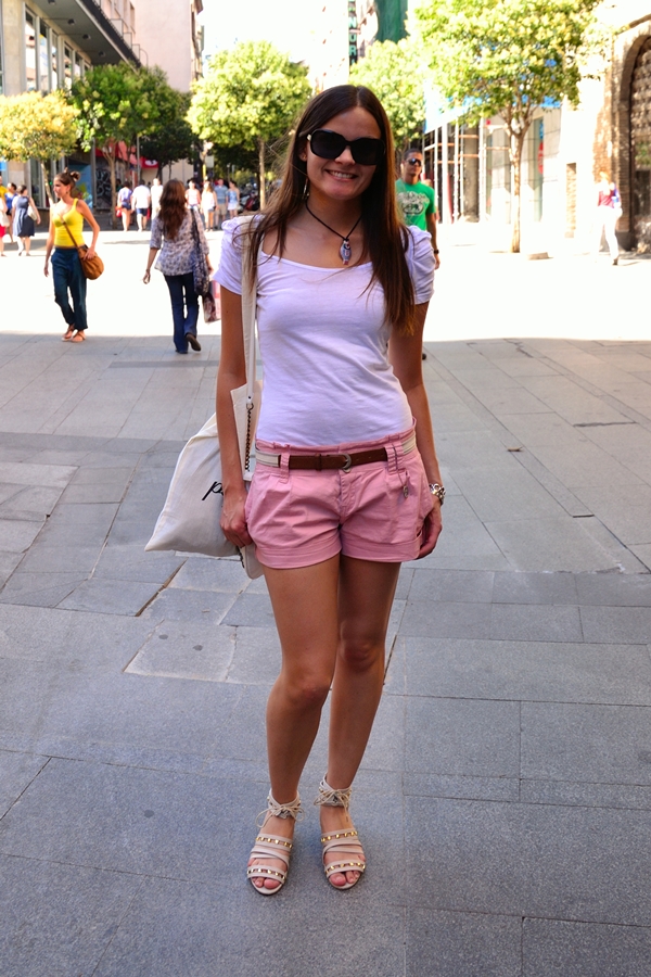 Tania lleva unos shorts de Bershka, con una camiseta blanca de algodón y unas sandalias de tiras atadas al tobillo con detalles en dorado, de Blanco.