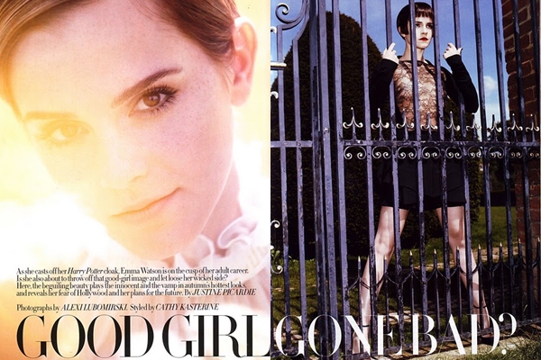 Bajo el título de Good girl, gone bad? nos muestran las dos caras de la actriz: de la más ingenua y angelical, a su lado más vamp y sensual. Independientemente de que nos guste o no cómo le queda esa peluca que le han puesto para la segunda parte del reportaje, a mí me ha encandilado esta foto que veis debajo, con un precioso vestido blanco de corte imperio de tul y gasa con mangas de farol. Y mi pregunta es: ¿por qué no la vimos lucir algo así en el estreno de Harry Potter y las reliquias de la muerte, en lugar de ese Oscar de la Renta que no la favorecía en absoluto y le hacía la piel amarillenta y apagada?