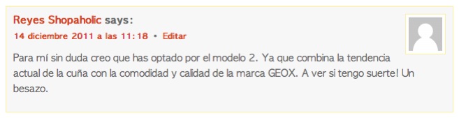 Quería aprovechar este último post del año para agradeceros a todos el regalo de incalculable valor que supone para mí que estéis ahí día tras día, leyendo mis palabras y participando y ayudando al blog a crecer con vuestros comentarios. Me alegro mucho de compartir con vosotros esta pasión por la moda y la belleza. Y como no se me ocurría mejor despedida, quiero terminar el 2011 desvelando el nombre de la ganadora del reloj colgante de estilo vintage que he sorteado entre todas las que predijeron que mi obsesión por los zapatos me había llevado esta vez a hacerme con unas comodísimas botas Geox.