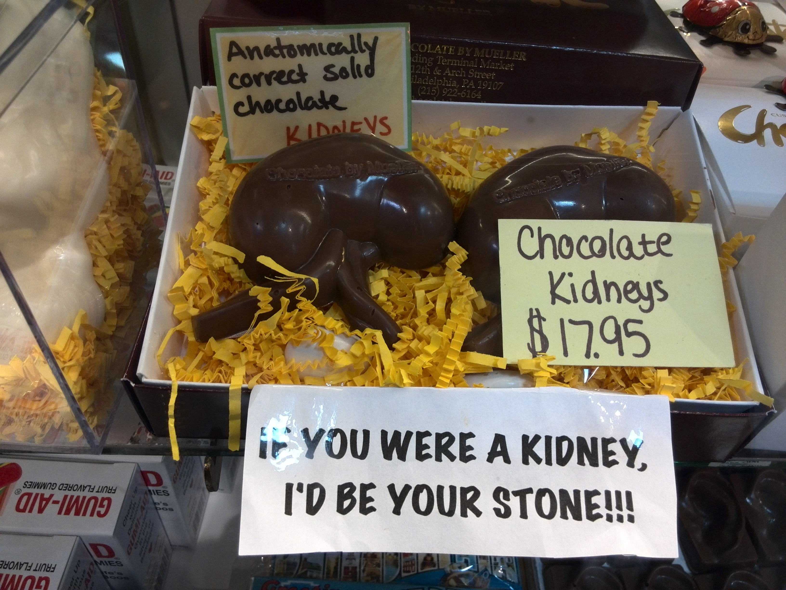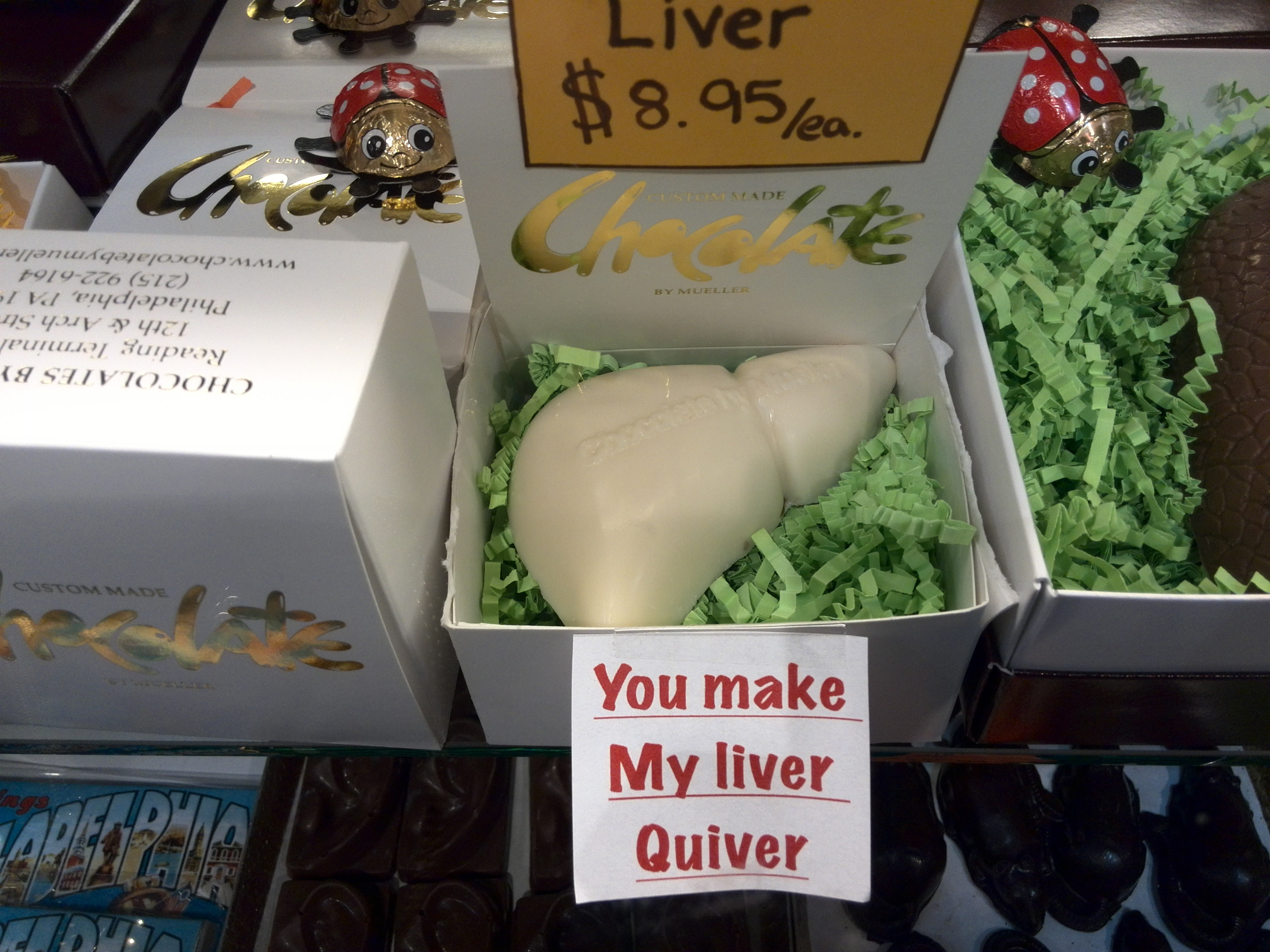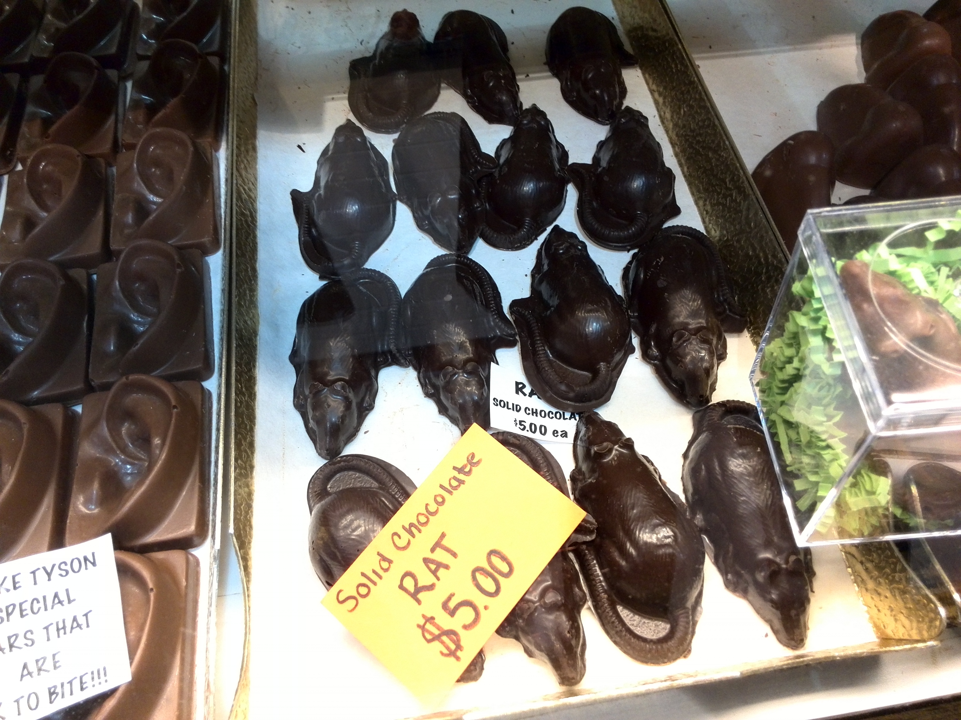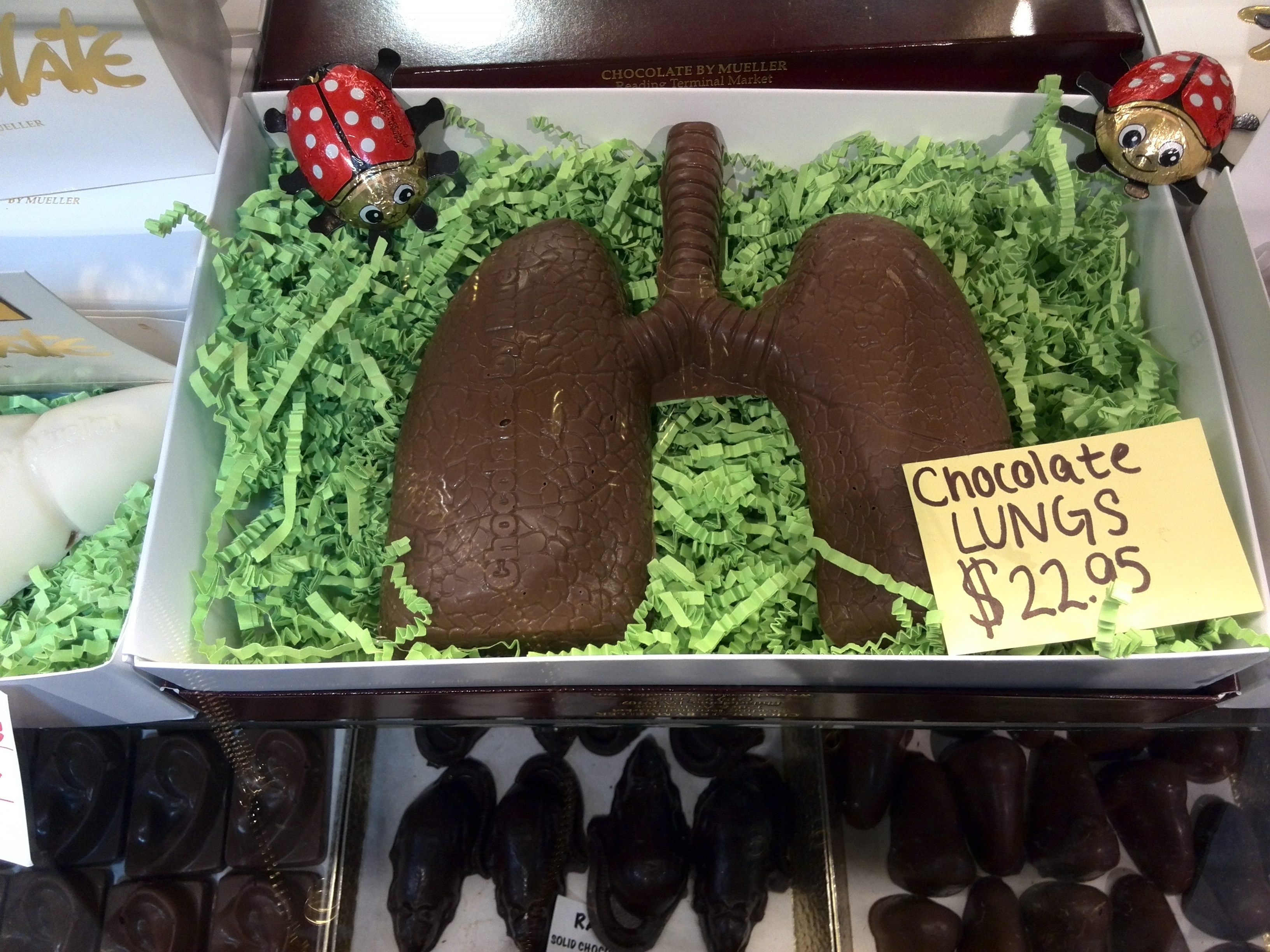 Como apéndice a estas tres comidas curiosas que he descubierto en mi viaje añadiré que no hay figura que no sea susceptible de reproducirse en chocolate macizo, incluido cualquier tipo de órgano vital. ¿Quién quiere turrón de Suchard pudiendo hincarle el diente a unos pulmones de chocolate con leche, o a un delicioso hígado de chocolate blanco?