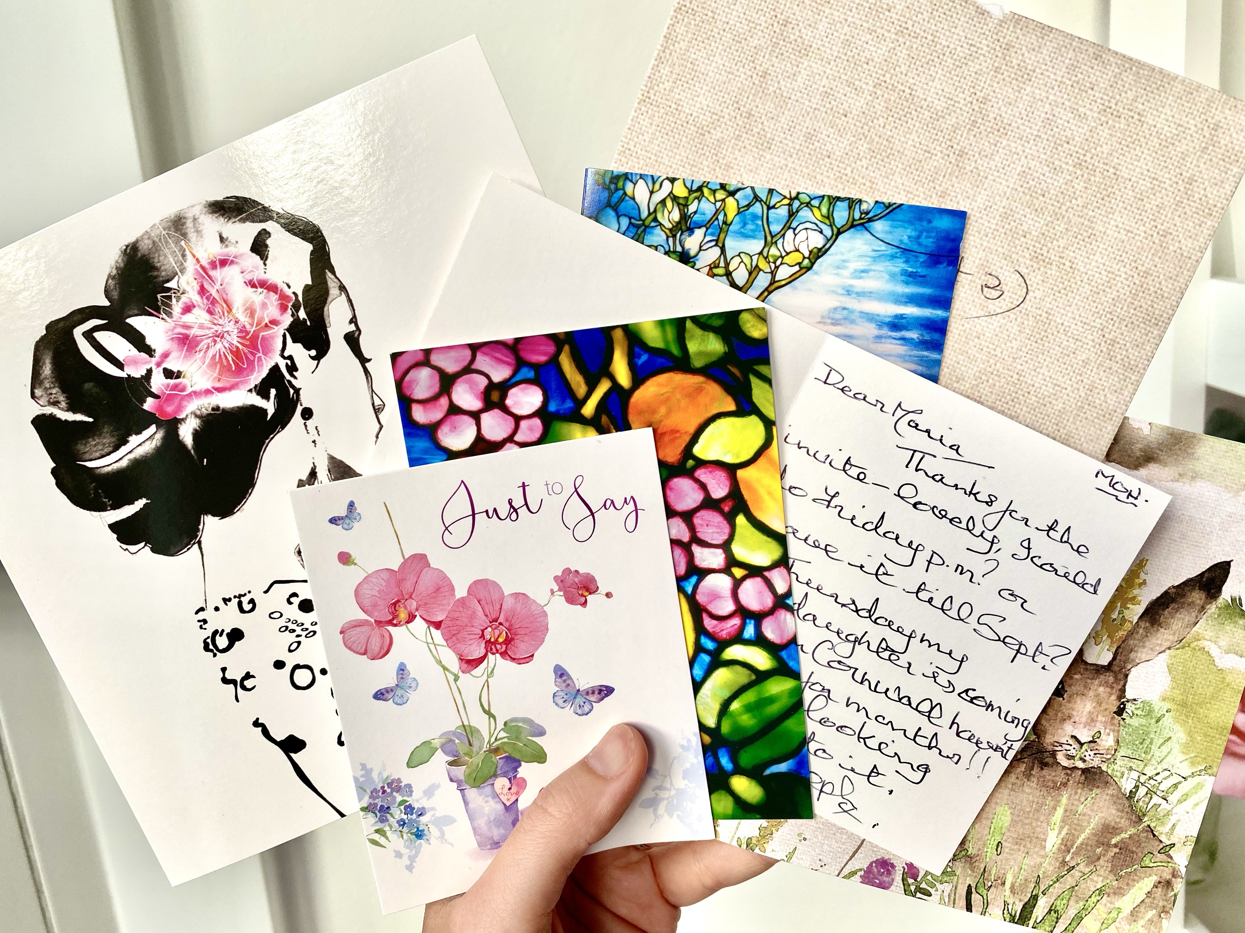 Cuando recibí la primera me pilló un poco desprevenida y tuve que ir a una papelería expresamente a comprarme un set de tarjetitas con sobres para poder contestarle. Ahora ya no me faltan nunca tarjetas de este tipo en casa. Se han convertido en mi WhatsApp particular con ella. ❤️